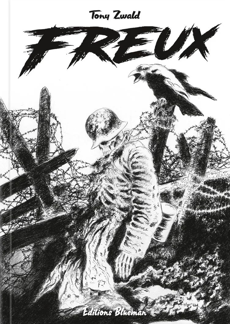 Illustrateur taphophile (qui a la passion des cimetières), Tony Zwald présente un récit en noir et blanc qui nous ramène durant la première guerre mondiale, au cœur des tranchées et dans la tête des soldats des Sturmtruppen allemand. Dans l'atmosphère désolée complètement lunaire du champ de bataille, on suit le quotidien de soldats allemands qui se laissent prendre chacun leur tour par la folie. Une démence logique due aux conditions dantesques de l'environnement hostile. Seul le corbeau noir, aussi appelé « le freux », semble se sentir dans son élément. Pour retranscrire cet univers morbide et décharné, Tony Zwald use d’un dessin au noir et blanc charbonneux, accordant la dimension sépulcrale. Il ajoute à cela un contexte psychologique angoissant. La psyché du soldat est mise à rude épreuve dans ce contexte de guerre effroyable. La folie se mélange au quotidien et la mort guette à chaque rangée de barbelés dans ce lieu maudit que sont les tranchées. La mort est ici associée au freux, ce corbeau noir que l’on peut interpréter comme l'émissaire de la faucheuse.