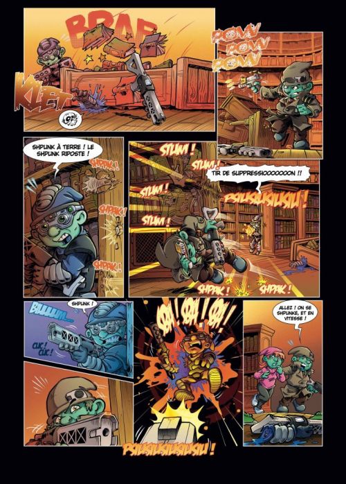 Edité par une maison indépendante imprononçable (eRe2-LSOM) et financé grâce à une opération Ulule, Shpunk Runner 2066 ne fait d’emblée pas mystère de son caractère parodique et plutôt culotté. Dès la première case, on identifie une relecture des Schtroumpfs de Peyo, mais qui se projette très vite dans un futur post-apocalyptique ultra-technologique et ultra-urbain digne du Nikopol de Bilal, avec l’apparition de Shpunks contaminés comme des zombies, façon Walking dead (et ils font « gnak », comme les Schtroumpfs noirs !). Ce patchwork de genres peut a priori paraître foutraque, mais il s’avère finalement cohérent et surtout très original : comment glisser du registre du conte médiéval à celui de la dystopie futuro-urbaine post-apo avec des zombies, sans bobo ! Le scénariste Rémi Hoffmann tricotte une narration accrocheuse qui avance bien et va au bout de son propos. Un détective à l’ancienne (trench coat, clopes, whisky…), bientôt rejointe par une étudiante, enquête sur un complot génético-technologique visant à la conquête du monde par une puissante organisation mégalo. C’est très rythmé, un peu gore, bourré de références, s’appuyant sur des dialogues et un découpage plutôt maîtrisés (hormis quelques rares coquilles… un écueil plutôt classique dans ce genre d’ouvrage auto-édité), dessiné à l’aide d’une griffe semi-réaliste largement éprouvée par Guillaume Albin qui a fait ses classes sur le Donjon de Naheulbeuk… et sans doute réhaussé par une colorisation un peu trop criarde. Un tome 2 est potentiellement prévu : le final nous abandonne en plein cliffhanger, avec un « A suivre… ».
