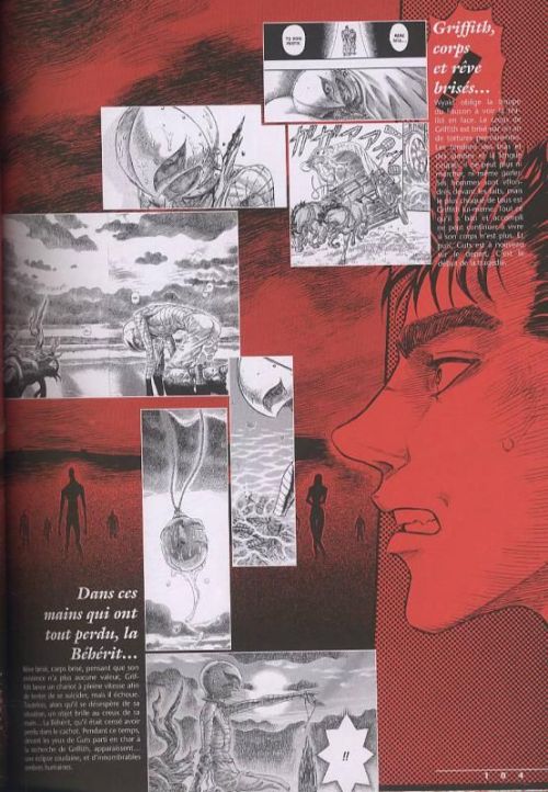 La série Berserk compile beaucoup d'illustrations en couleurs, principalement des pages-titres de chapitres et de volume. Visuellement, c'est indéniablement beau, les dessins sont très travaillés et le grand format est bien adapté à leur contemplation. Toutefois, l'ouvrage ne s'arrête pas là, il propose également des compléments tels quelques fiches de personnages, des informations générales et une interview de l'auteur. Cela donne un peu plus de consistance à l'ensemble et livre quelques révélations intéressantes. Cet ouvrage est donc bien plaisant et devrait séduire les fans de l'histoire.